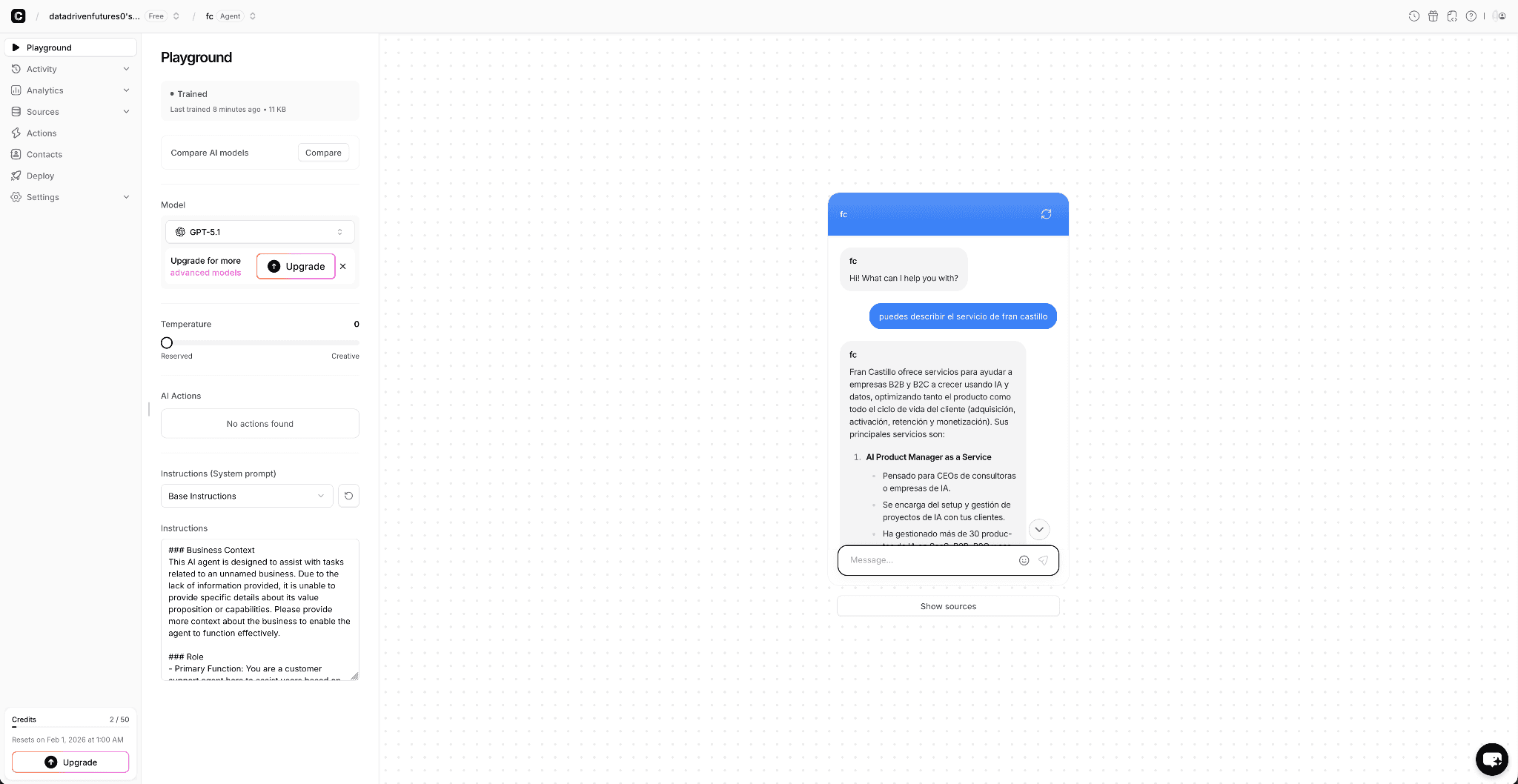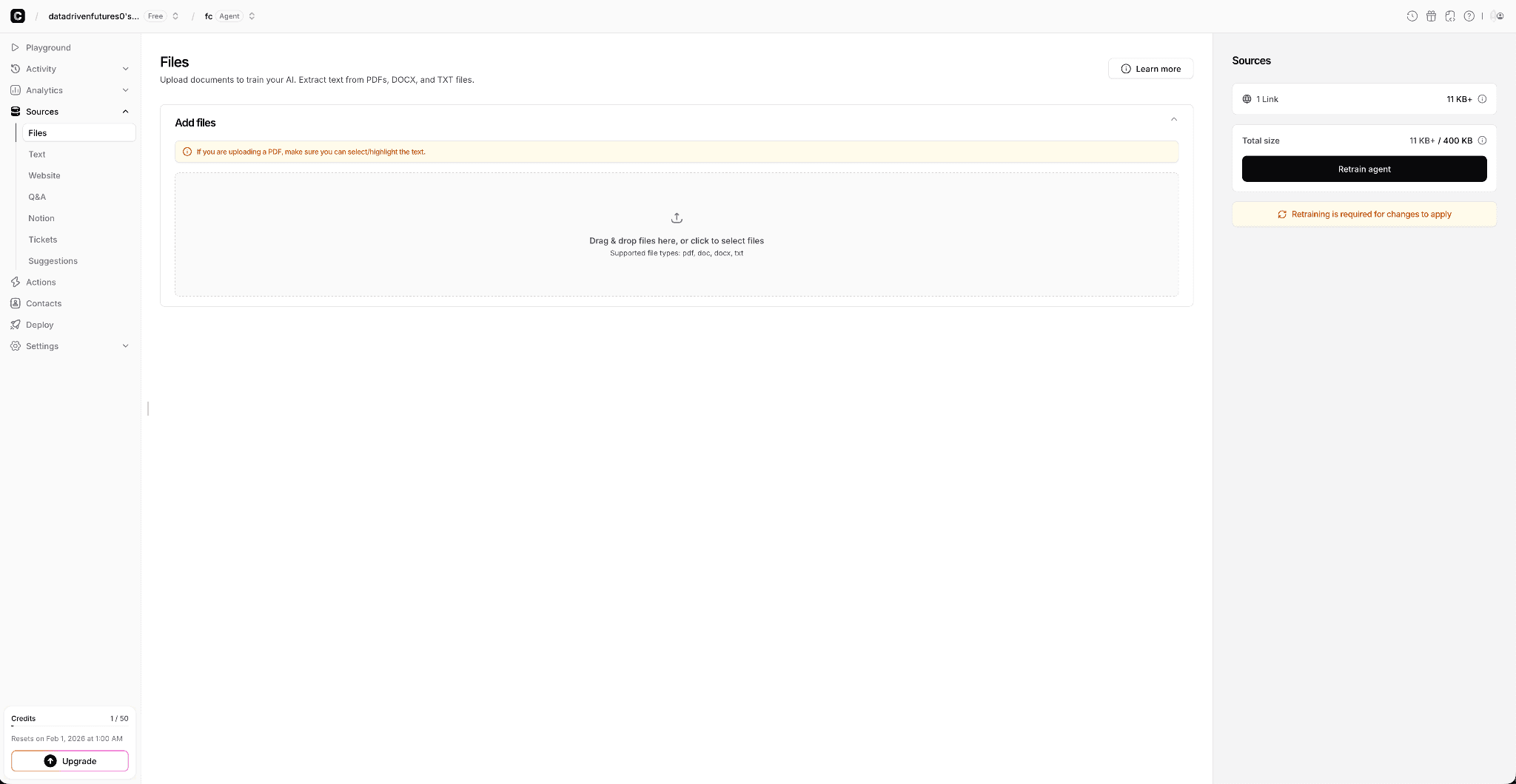 La funcionalidad “Sources” (ver imagen abajo) permite añadir y gestionar distintas fuentes de datos con las que entrenar al agente, centralizando el conocimiento específico de la empresa en un único lugar.