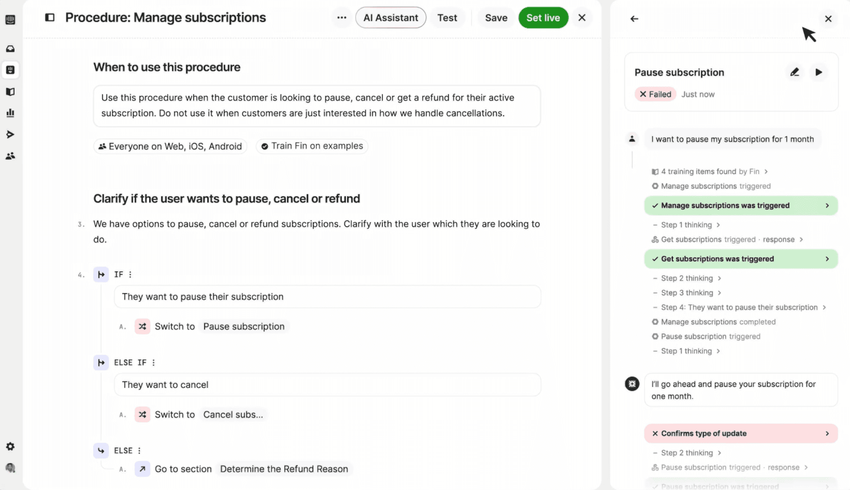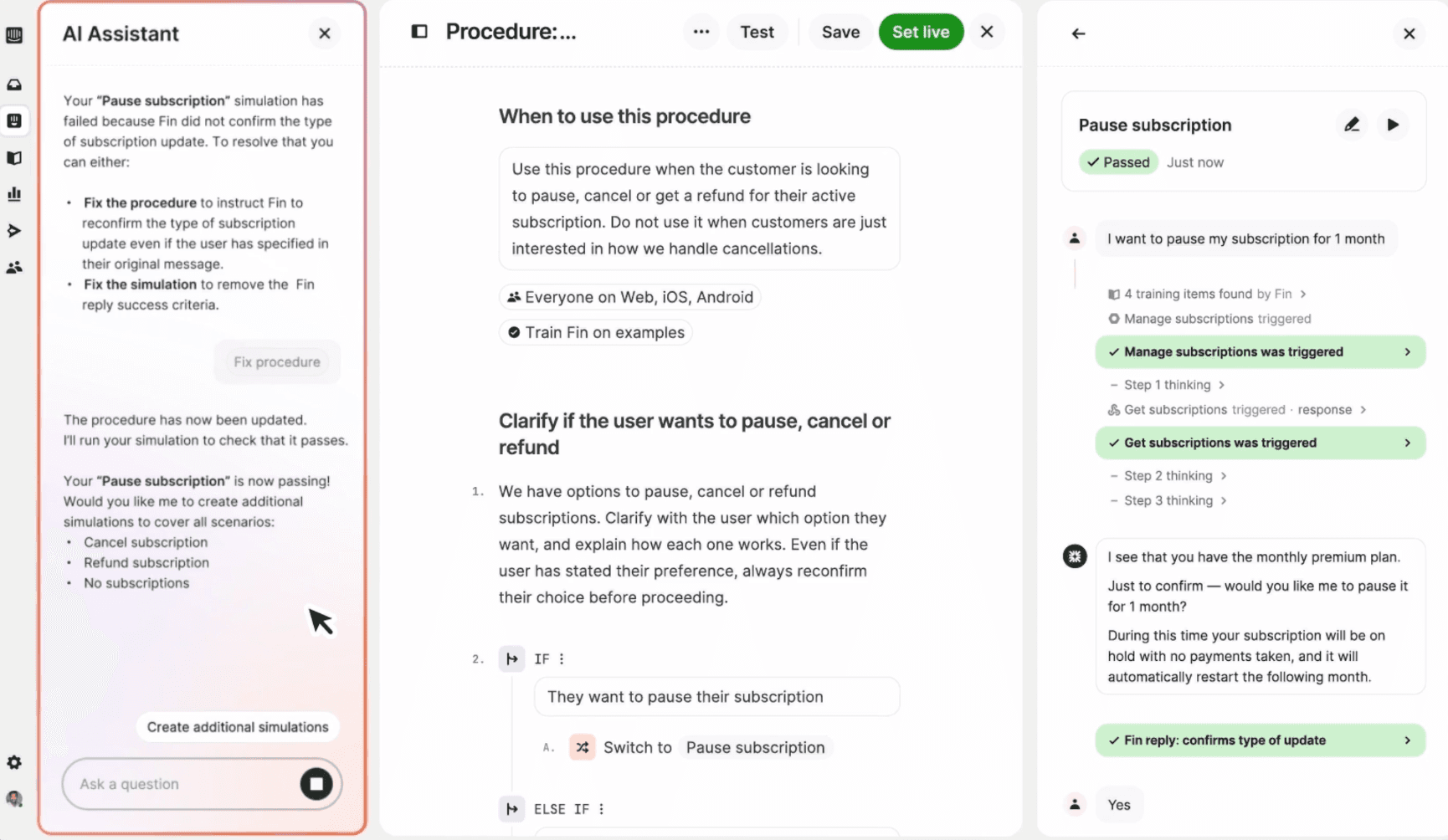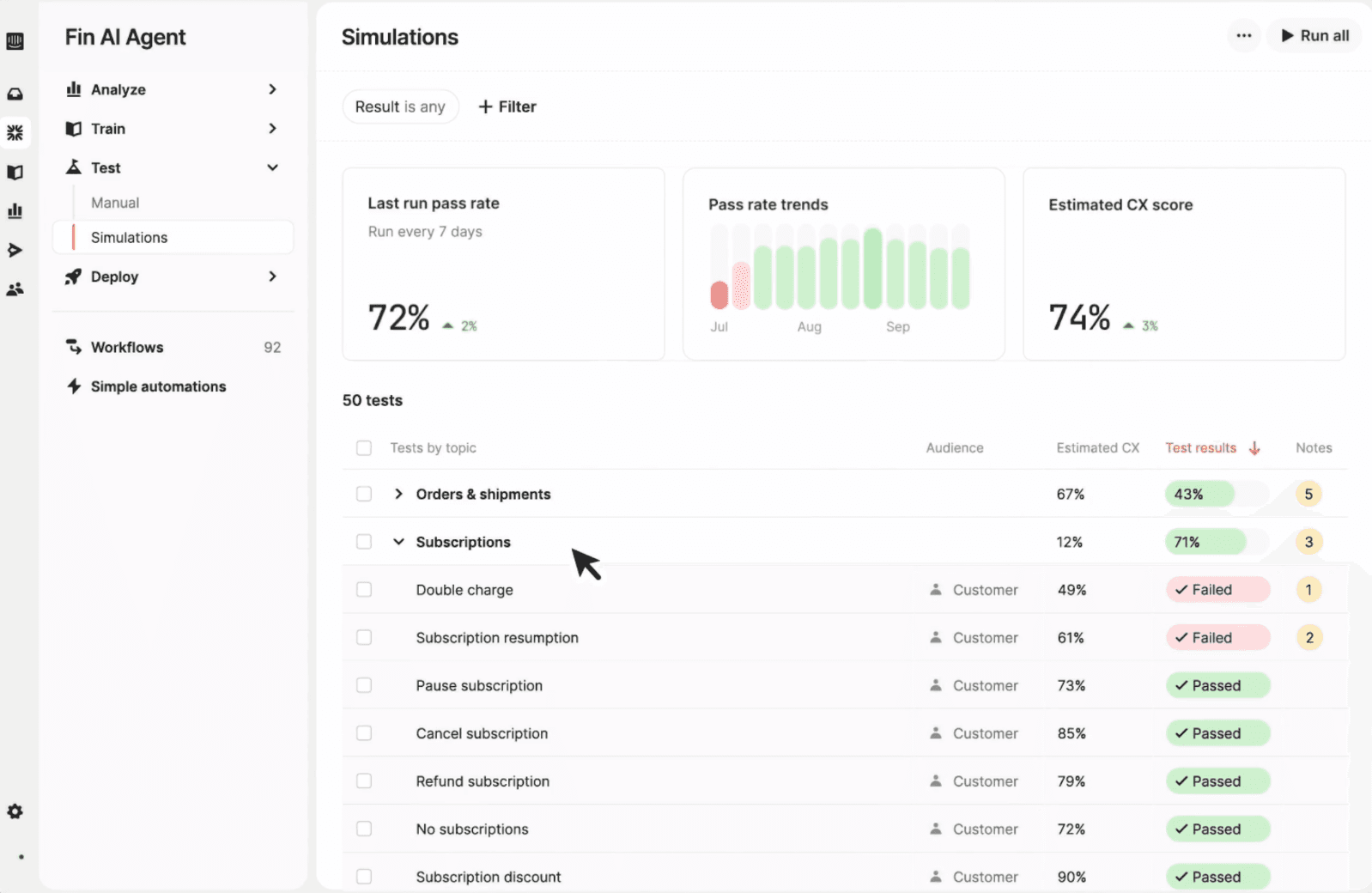 Un ejemplo muy interesante de esta aproximación es el sistema de simulaciones de Fin, Intercom, que permite testear agentes mediante conversaciones completamente simuladas antes de su despliegue.