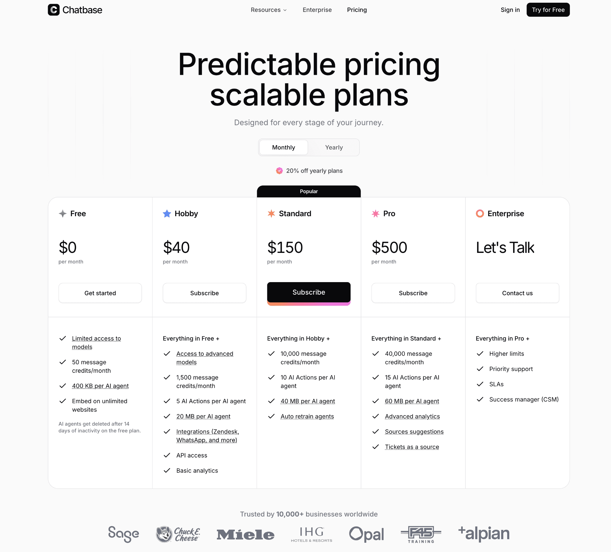 Actualmente, el modelo de precios de Chatbase resulta excesivamente complejo para el usuario. El precio se construye a partir de múltiples métricas: