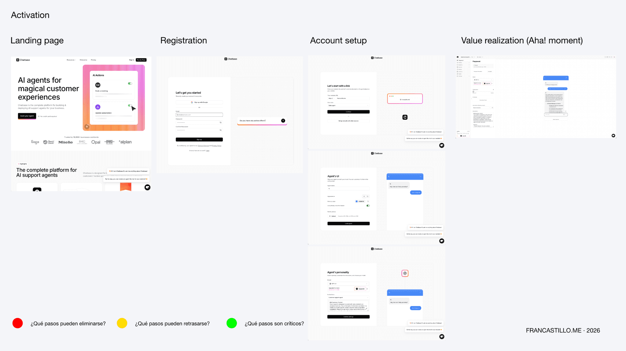Chatbase ya ha reducido gran parte del trabajo pesado del setup gracias a procesos automáticos de captura de información del negocio. El siguiente paso es guiar activamente al usuario desde la configuración hacia la evaluación real del agente, acelerando el momento en el que experimenta el valor del producto.