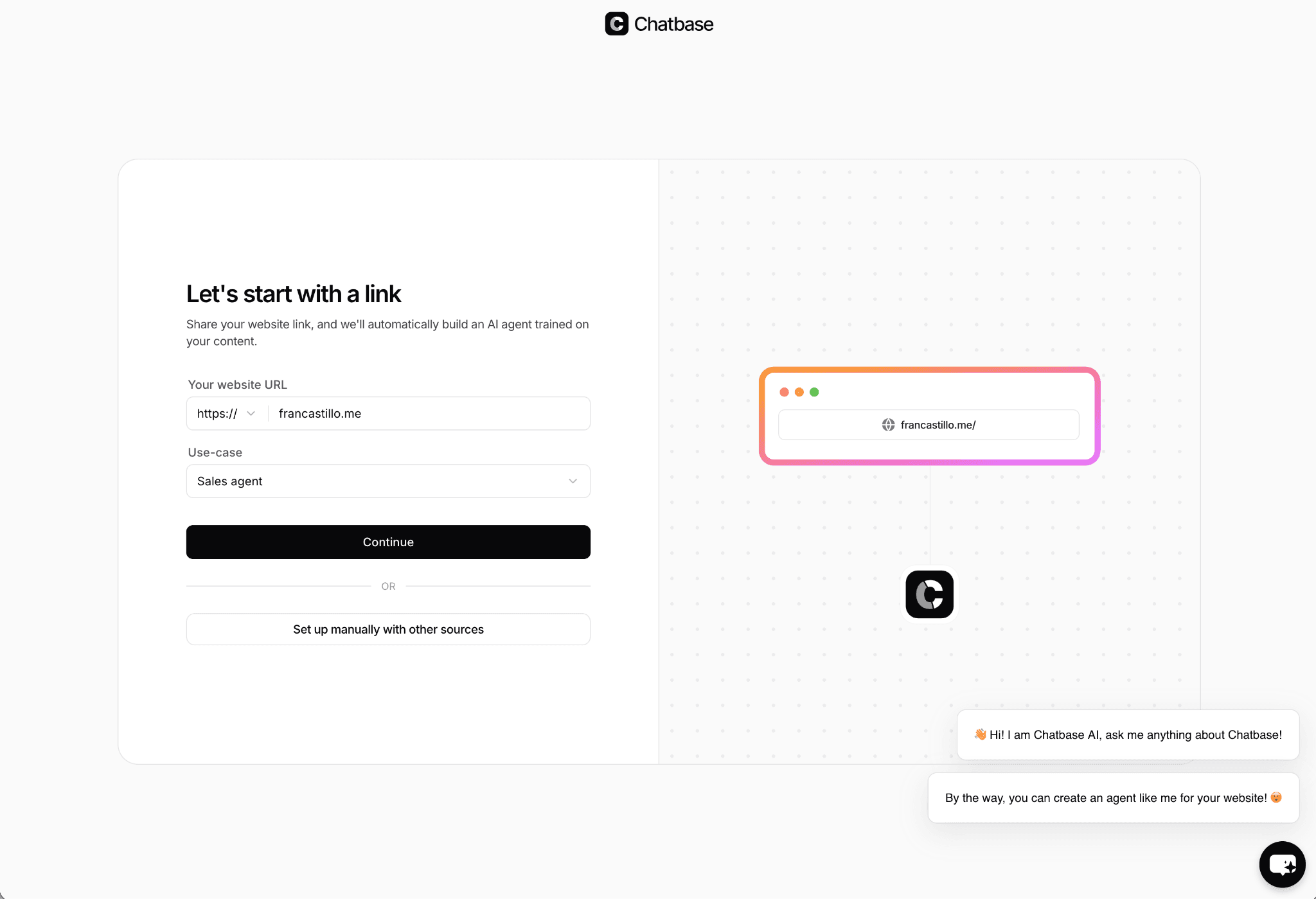 Uno de los grandes retos de las plataformas de agentes de IA es personalizar las respuestas del agente al contexto específico de cada empresa. Chatbase aborda este problema desde la primera interacción del proceso de onboarding.
